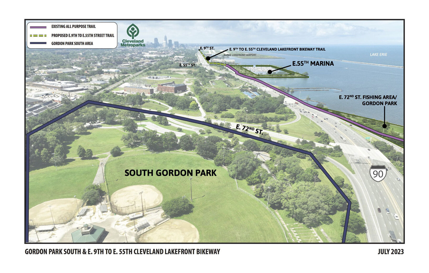 Cleveland Metroparks was awarded a $13 million grant from the Mandel Foundation to transform Cleveland’s east side lakefront. $5 million will help fund the construction of the Downtown Connector Trail portion of the Cleveland Lakefront Bikeway, which currently exists from East 55th Street to MLK, Jr. Boulevard. The new Downtown Connector Trail, which will run from East 9th to East 55th Street, will provide safe access to the lakefront for pedestrians traveling on foot or bicycle and will connect to the existing trail, linking the Downtown and University Circle neighborhoods. $8 million will fund the creation of a new Gordon Park Reservation, combining North and South Gordon Parks as one public greenspace under Cleveland Metroparks management. The vision is a cohesive lakefront park, connecting the neighborhoods of St. Clair Superior and Glenville to Lake Erie and activating the entire Gordon Park with a variety of active and passive recreational amenities.
